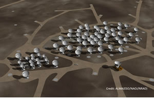 アルマは、東アジア(日本:国立天文台様が主導)、北アメリカ、ヨーロッパが協力して、チリの標高5,000メートルの高原に建設した、世界最高の解像度の天体電波画像を得ることができる大型電波望遠鏡です。山手線の内側と同程度の規模である、直径約18.5キロメートルの敷地にパラボラアンテナを66台配置し、アンテナから受信したミリ波・サブミリ波(注1)の信号を計算機で処理することで、最大直径18.5キロメートルの巨大なパラボラアンテナを使った場合と同等の高画質な電波画像が合成できます。これにより、宇宙ができて間もない頃の生まれたての銀河や、星の誕生や太陽系のような惑星系の誕生、有機分子などの生命に関連した物質など、光(可視光)では見えない暗黒の宇宙が見えてきます。