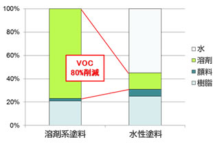塗料は、塗膜になる成分として色や光沢を出す顔料と膜になる樹脂があり、また塗膜にならず揮発する成分として塗料を希釈し塗りやすくする溶剤と助剤で構成されます。VOCの大部分が溶剤に含まれることから、VOC削減には、溶剤によって樹脂を溶かす溶剤系塗料から、水に塗料を混ぜて使う水性塗料への切り替えが有効です。