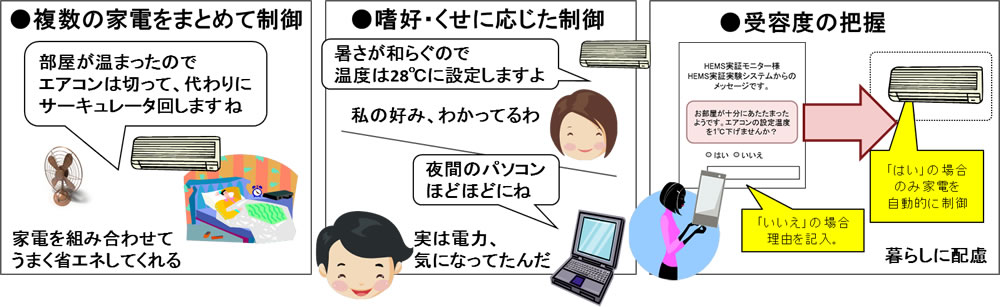 また、パーソナリティ(暑がり・寒がり、面倒くさがり・小まめ)、ライフステージ(幼児、受験生、高齢者がいる世帯)、ライフスタイル(朝型・夜型、昼間不在がち)など、世帯の特性を捉えた機器の制御を実行します。