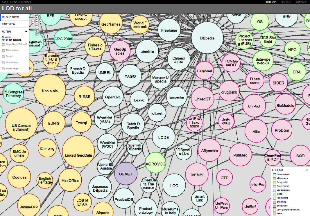 - Web上での新しいデータ公開形式であるLinked Data形式で公開されているデータセット群。Web関連技術の標準化団体W3C(World Wide Web Consortium)が推奨しており、機械処理が容易で特定のアプリケーションに依存しないRDF(Resource Description Framework)と呼ばれるデータ表現形式を使用。