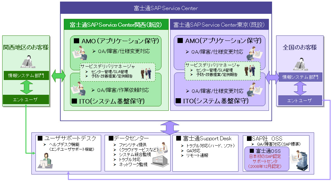 本センターでは、SAPシステムの専門要員を常駐させ、2009年から開設している「富士通SAP Service Center東京」で培われたSAPシステムに関する技術・ノウハウを元に、関西地区のお客様へ、より迅速に専門性の高いSAPシステムの運用・保守サービスを提供します。
