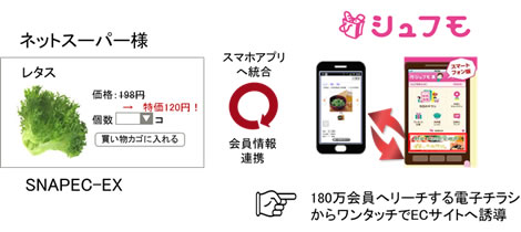 「SNAPEC-EX」とニフティ株式会社(本社:東京都新宿区、代表取締役社長:三竹兼司)が提供する「シュフモ」をデータ連携し、電子チラシからお客様のECサイトへ誘導することが可能となります。
