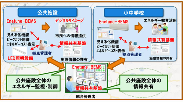 当社のクラウド型エネルギーマネジメントサービス「Enetune-BEMS」は、複数拠点のエネルギー利用状況を計測し、クラウドへの集約、統合的・横断的な見える化と、需要予測などの分析、遠隔制御などにより、エネルギーコストの削減を実現するサービスです。このサービスをベースに、伊達市様においては、以下を実現します。