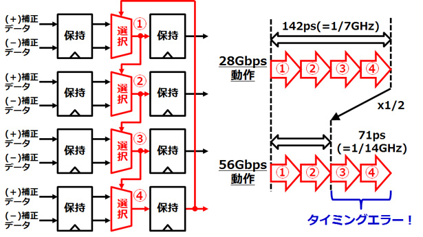 56Gbpsの通常の回路設計でDFEは16個を連結させて使用しますが、例えば4個の場合は、4分の1の周波数で動作させます。したがって、28Gbpsで4個の場合、4分の1の周期は142ピコ秒となり、この時間内に4ビット分の補正をすべて完了することができました。しかしながら、56Gbpsの場合、4分の1の周期は71ピコ秒となり、半分の2ビット分の補正までしか収めることができず、タイミングエラーとなっていました(図3)。