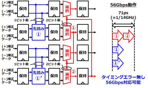 先読み回路の演算時間は、選択器の選択時間とほぼ同じであるため、全体の演算時間は2ビット前のデータから決定する選択器の数に依存し、4ビット構成の場合2となります。これにより、56Gbpsの4分の1周期である71ピコ秒に演算を収めることができます。その結果、従来の2倍の通信速度である56Gbpsでのデータ受信が可能となりました。