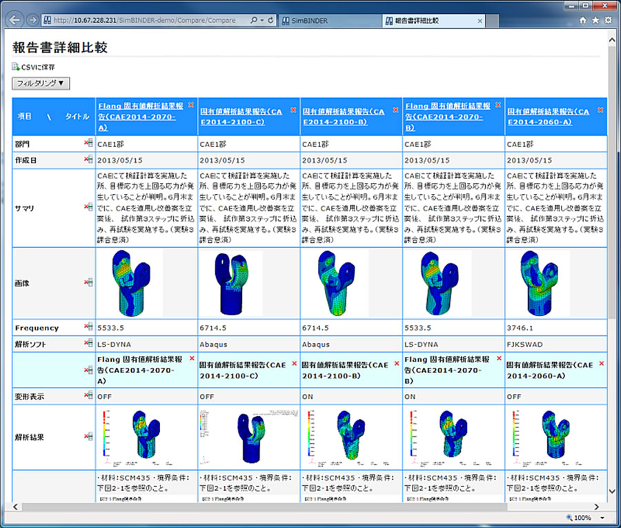 複数の技術報告書を選択して、報告書に記載された登録情報を一覧表示することができます。情報を横並びに表示して比較検討することで、パラメーターの限界値や時系列変化の傾向など、これまで見過ごしていた新たな知見の獲得を可能にします。