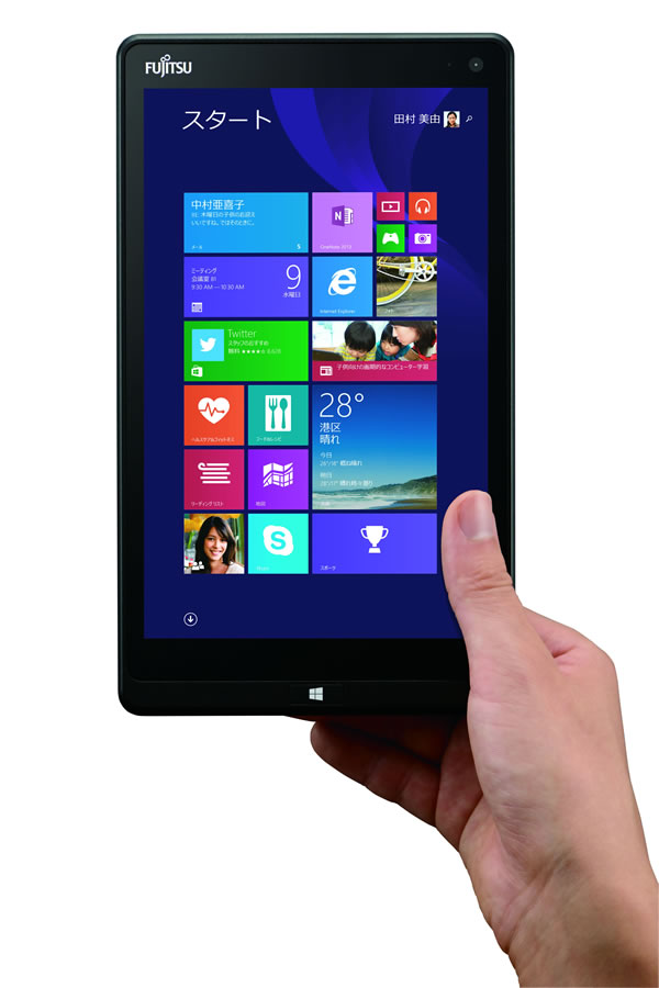 「Windows 8.1」搭載の8型ハンディーサイズタブレット「ARROWS Tab QH33/S」は、横幅126mmと片手で持ちやすく、重量はシステム手帳と同程度の約390gのため、長時間の使用でも疲れにくい設計です。背面には触り心地の良い3Dテクスチャを採用し、側面は角度をつけて指がかかりやすい形状にするなど、持ちやすさにもこだわりました。