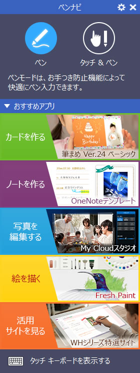 標準添付の専用タッチペン利用時に、液晶に手が触れても書き込みできるペンモード(注4)や、画面を紙に近い色味に自動で調整するペーパーモードを搭載するなど、ペンの使いやすさにもこだわりました。また、2mmのペン先検出を実現しており、細かな描写も可能です。さらに、ペン入力が楽しめるアプリケーションを自動表示する「ペンナビ」機能を搭載しました。標準搭載ソフトウェア「筆まめ Ver.24 ベーシック 富士通版」を使用することで、手書きのメッセージを添えたカードやハガキを作成して想いを届けることができます。