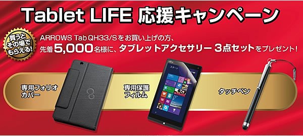 「ARROWS Tab QH33/S」をご購入のお客様、先着5,000名様に、タブレットライフをより快適に楽しめるアクセサリー3点セットをプレゼントする「Tablet LIFE 応援キャンペーン」を実施します。持ち運びにも安心でタブレットスタンドとしても使える専用フォリオカバー、液晶面を保護する専用フィルム、タッチ操作や手書きにも便利なタッチペンの3点をセットにしてプレゼントします。