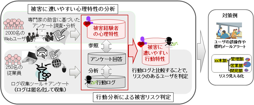 今回、ネット上のアンケートによりウイルス被害・詐欺・情報漏洩という3種類の被害に遭いやすい人の心理特性と行動特性の関連を明らかにするとともに、PCフリーズ時などのPC上の行動ログから、ユーザーの被害リスクを算出する技術を開発しました。