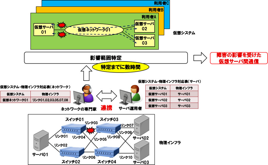 通常、クラウド環境では、ネットワークを管理するネットワーク運用者と物理サーバを管理するサーバ運用者が存在しており、各運用者が自身で管理している機器の範囲で仮想システムと物理インフラの対応付けを管理しています。従来の運用管理技術でもネットワーク障害の影響を受けた仮想システムまでの特定は比較的短い時間で実現できていましたが、より詳細に絞り込んだ影響範囲の特定を行うためには、ネットワークに精通したネットワーク運用の専門家がサーバ運用者と連携し、通信装置の設定情報などから、仮想サーバ間のすべての通信に対して経由する物理リンクを対応付ける必要があり、大規模なクラウド環境では影響範囲の特定までに数時間を要していました(図1)。