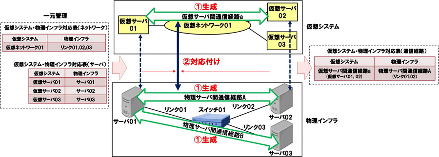 仮想システムと物理ネットワークの通信経路情報の対応付けを自動化することにより、ネットワーク障害の影響を受けた仮想サーバ間通信を短時間で特定する技術を開発しました。