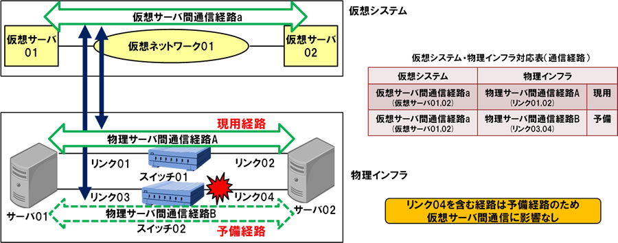 物理ネットワークの中で信頼性向上のために冗長構成を採用している場合、物理ネットワークの通信経路情報に加えて、通常使用する現用経路あるいは予備経路を示す状態情報を管理するようにしました。こうすることで、障害発生時に影響を受けた物理サーバ間の通信経路が現用経路である時に限って影響ありと判断し、実際にサーバ間通信に影響のあったものだけを特定します(図3)。