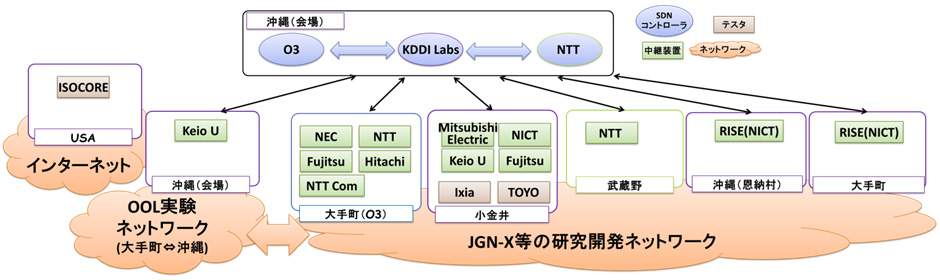 4月20日~22日に開催される国際会議iPOP2015の公開デモンストレーションでは、日本電信電話株式会社(以下NTT)、一般社団法人沖縄オープンラボラトリ(以下OOL、注4)、及び広域ネットワークへのSDN適用を目指す研究開発「O3プロジェクト(注5)」と協力して、関東3拠点(小金井、武蔵野、大手町)、及び沖縄1拠点(iPOP2015会場)に構築したトランスポートネットワークドメインと、国内広域に展開されているRISEテストベッド(注6)のネットワークドメイン(RISE沖縄、RISE関東)、さらにはインターネット経由で米国拠点(ISOCORE、注7)の計7拠点を接続したトランスポートネットワークを用意し、iPOP2015会場に設置したSDN/OpenFlow(注8)ベースの制御装置からの遠隔制御により、関東の各拠点とiPOP2015会場を接続する複数の通信フローを設定できることをお見せします。