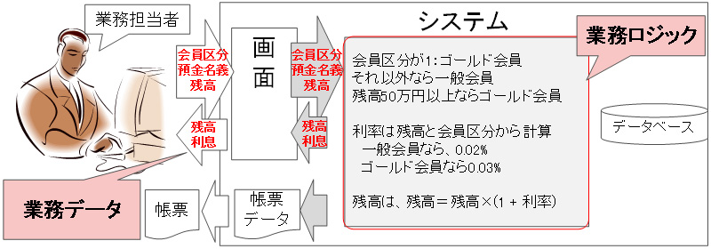 業務データは入出力データの一部となっているため、プログラムの入出力となっているデータを、業務データとみなして処理をします。業務データに対する条件判断や計算処理を、業務ロジックとして扱いますが、チェック処理などは、条件判断ではないため業務ロジックから除きます。
