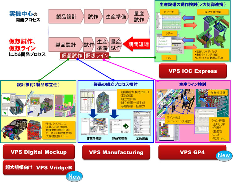 今回新たに、鉄道車両、自動車、航空機など、10万部品を超えるような超大規模な3次元データにおいて、組立時に部品が干渉しないかなどのフルアセンブリモデル(注1)での設計検討(製品成立性)を可能とする「VPS VridgeR(ブリッジャー)」と、生産ラインのシミュレーションを可能とする「VPS GP4(ジーピーフォー:Global Protocol for Manufacturing)」を「VPS」のラインナップに加えました。また、このほか既存のVPSのほか製品もあわせて、性能向上と操作性向上を行い、処理時間を大幅に削減しています。