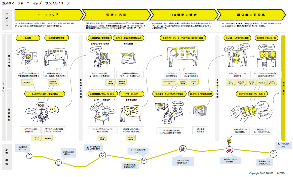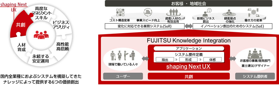 当社は、ICTを活用し、ビジネスモデルの変革や新たな価値創造を図るデジタルビジネス時代を牽引する新しいインテグレーションのコンセプトを「FUJITSU Knowledge Integration(フジツウ ナレッジ インテグレーション)」(注2)として提唱しています。このコンセプトに基づき、お客様と地域社会、そして当社との共創により、製品・サービス開発強化や新たな価値創造を目指す「攻めのIT」の実現を支援するため、真のユーザーニーズを満たすシステム構築を支援するコンサルティング「shaping Next UX」を提供します。