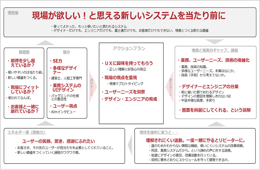 AImインタビューは株式会社富士通研究所(注3)が開発した技法であり、個人や組織がもつ価値観や理想像、問題意識などを構造化し、中長期的なビジネスコンセプトをデザインするための定性調査技法です。ユーザー、あるいは今後ユーザーとなる人々へのインタビューで活用され、現場の理想的な働き方や潜在的なユーザーニーズを導出します。