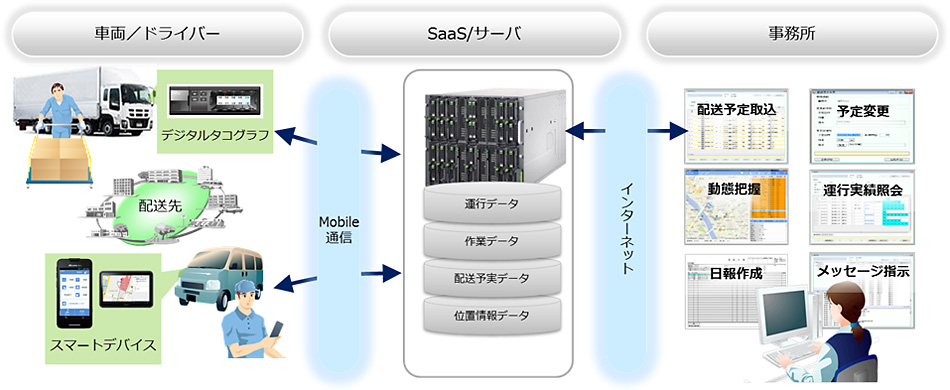 これにより、専用の車載機などが不要なため運用コストの大幅な削減につながるほか、安全かつ品質の高い輸配送業務を行うことが可能です。