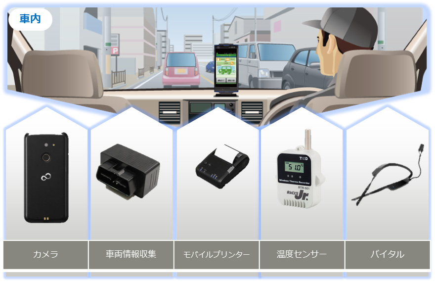 車載デバイスとしてデジタルタコグラフとスマートデバイスの混在運用や、ドライバーの眠気検知などを実現