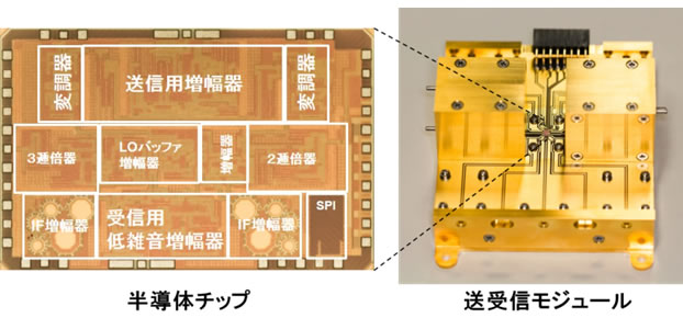 国立大学法人東京工業大学(注1)(以下、東京工業大学)と株式会社富士通研究所(注2)(以下、富士通研究所)は、無線装置の大容量化を目指して、72から100ギガヘルツ(以下GHz)と広い周波数範囲にわたり、高速に損失が少なく信号処理できるCMOS無線送受信チップとそのモジュール化技術を開発しました。これにより、世界最高速となる毎秒56ギガビットの無線伝送に成功しました。