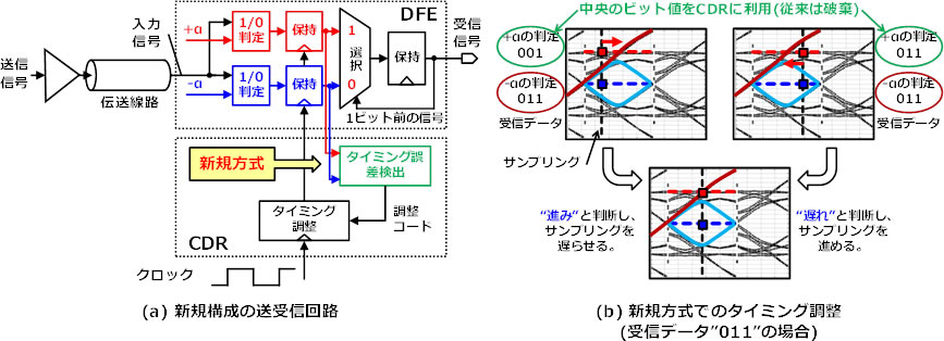 従来の送受信回路においては、劣化した信号を補償する回路であるDFE(Decision Feedback Equalizer)と、入力信号のタイミング誤差を検出する回路であるCDR(Clock and Data Recovery)の占める消費電力が、送受信回路の全消費電力の約3分の2と大きく、これらの消費電力を低減することが課題でした。
