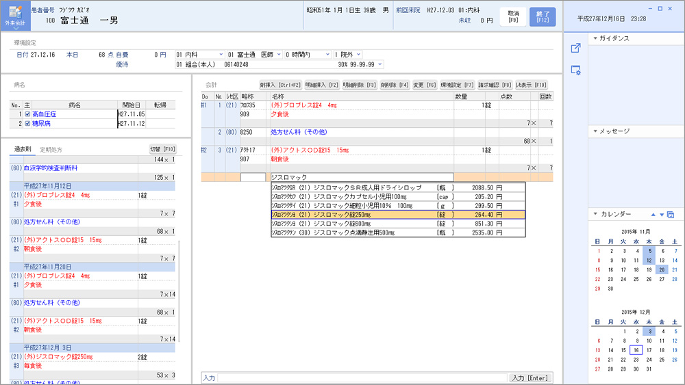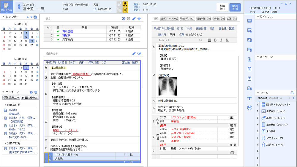 カルテ入力の際には、初回来院時には検査、2回目来院時には処置、というような、1人の患者の診療が複数日に渡る場合、電子カルテに入力する処置・処方予定などをまとめて入力できるようになりました。また、電子カルテを入力するための各種ツールを起動するショートカットキーの追加や、処方監査機能により発見されたエラーを修正する部分への自動的な移動などの機能改善も図っています。