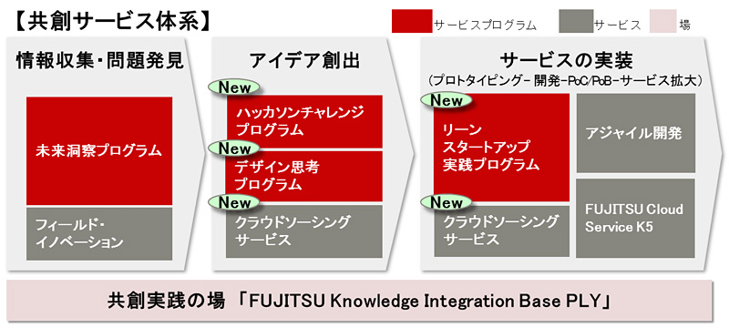 本サービスは、昨年発表した当社のインテグレーションコンセプト「FUJITSU Knowledge Integration(フジツウ ナレッジ インテグレーション)」を具現化するものです。当社がこれまでに実施してきたサービスインテグレーションやハッカソンなどの豊富な実績を活かし、ハッカソン、デザイン思考(注1)などのアイデア創出を支援する共創プログラムやリーンスタートアップ実践プログラム、およびクラウドソーシングサービスのような新しい事業の実装に向けたサービスを体系化して提供します。