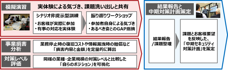 本演習は、当社の保有する業種・業態に応じたリアリティの高いシナリオをベースに行います。お客様にはシナリオの内容を事前に知らせない実践的な演習を行うため、お客様の現状の課題をより明確に抽出することができます。また本演習は、複数のお客様に対するセミナー形式での簡易型模擬演習サービスとしても提供します。