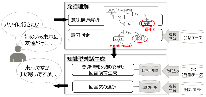 さらに、今回、国立大学法人東北大学大学院情報科学研究科の乾・岡崎研究室と共同で開発した、機械学習を使ってユーザーの発話の意図を判定する技術により、回答や質問、要求、意志、願望などの意図を正しく把握しながら目的の情報が得られるようスムーズに対話を継続させることができるようになりました。例えば、「ハワイに行きたかった」は願望であり旅行の目的地を述べてはいないと判断し、「ハワイですか、いいですね。ちなみに今日はどちらへ。」と返すことで、目的地の情報を得られるように対話を継続します。