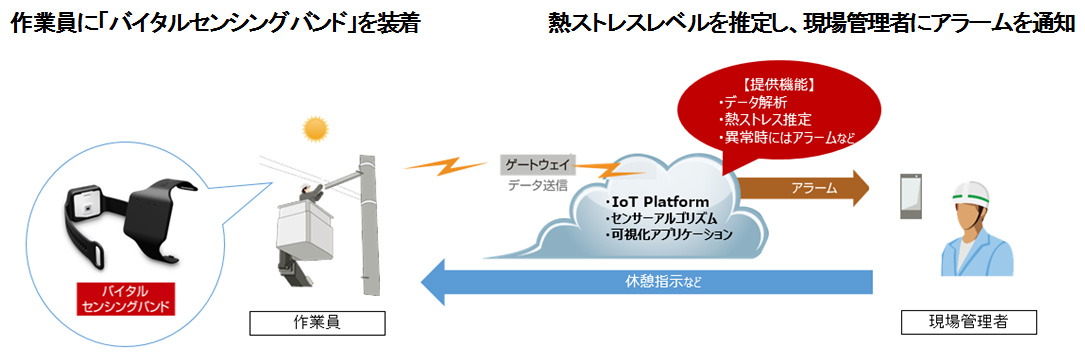 今回、簡単に腕に装着でき作業に影響しない「ユビキタスウェア バイタルセンシングバンド」を活用し、温湿度と作業員のパルス数を組み合わせた熱ストレス検知や身体負荷検知により、作業員一人ひとりに合わせた見守りを実施する実証実験を、関電工様と実施します。