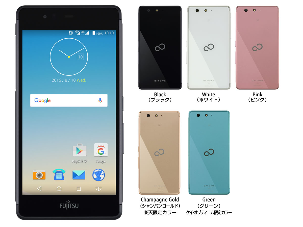 カラーバリエーションは、「arrows M03」の標準色となるブラック、ホワイト、ピンクに加えて、楽天限定カラーのシャンパンゴールド、ケイ・オプティコム限定カラーのグリーンを用意しました。