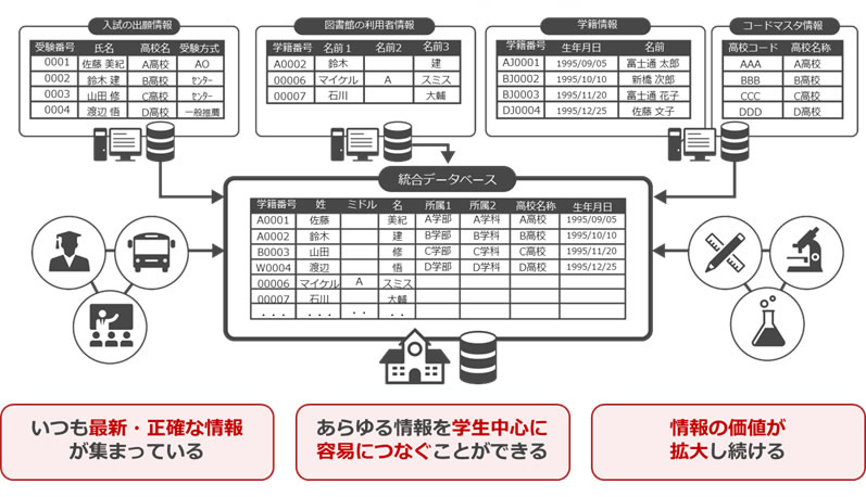少子化などにより大学間競争が激化しており、各大学は経営の改善や教育の質向上に向けた情報環境の整備が急務となっています。それを実現するためには、学生の入学から卒業・就職までの様々な情報を集約し、分析する必要があると考えられていますが、大学諸活動の情報は、教務部門、各学部、各研究室、学内図書館などに分散しており、これらを容易に集約・統合することは困難でした。