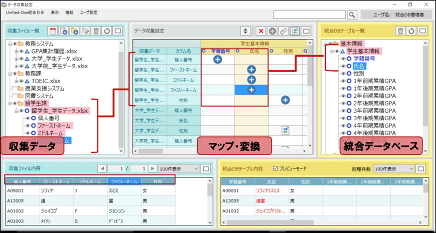 学生を中心とした収集データを簡単なGUIによりデータベースにマッピングすることができます。システムごとに異なるコードマスタの整備や学生情報を横串につなぐための変換処理など、これまで手間のかかっていたデータ統合を容易に実現することができます。
