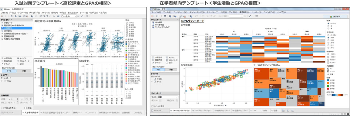 本製品には、Tableau Software社のBIツールであるTableauソフトウェア製品を利用しグラフ表示するためのインターフェースと28種類のグラフが表示できる分析テンプレート、分析の目的別にあらかじめ複数のグラフをセットした3種類のダッシュボードを装備しており、大学の教育の高度化や経営改善に向けたデータ活用を支援します。