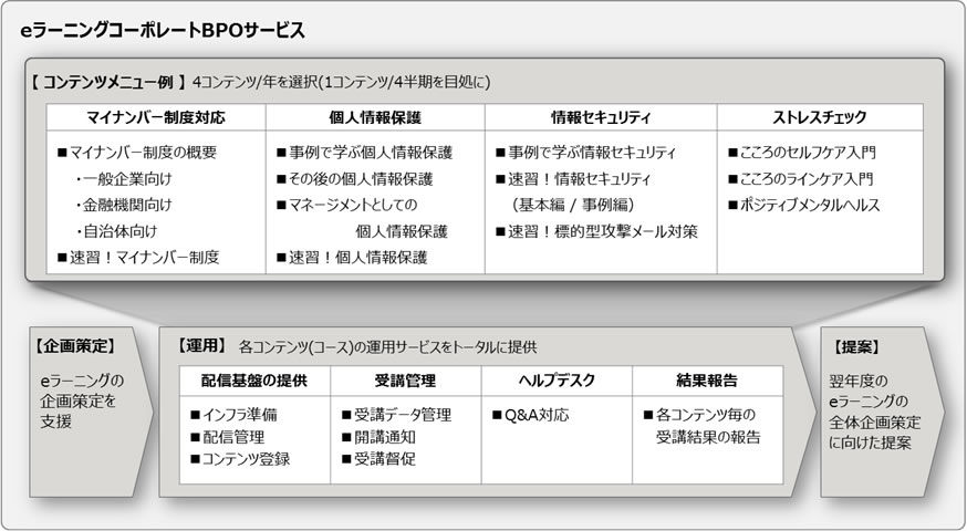 そこで当社は、これらのお客様課題への対応を目的に「eラーニングコーポレートBPOサービス」を年間契約で提供開始します。