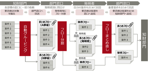 「ATMS PMV」では、ファミリー(注2)に加え、製品や技術分類、管理部門などの単位に含まれる複数の案件について、特許化の必要性や特許取得後の権利維持などの検討をまとめて一つのワークフロー上で行うことができる「まとめワークフロー」機能を提供します。これにより、従来1件ずつ行なっていた手続きを一括で行うことができるほか、単位ごとに特許の全体状況を把握できるため手続きの漏れなどを抑制し、業務効率化を実現します。