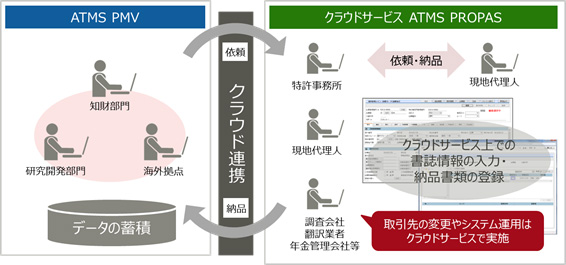 「ATMS PMV」は、企業と特許事務所や現地代理人などの外部パートナー間で、特許管理業務のための情報共有やデータの同期が行える特許管理クラウドサービス「ATMS PROPAS(アトムス プロパス)」と連携可能です。これにより、企業と外部パートナーで、特許管理データのシステム登録業務の効率化や諸手続きの迅速化を実現できます。