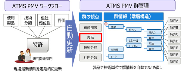 「ATMS PMV」では、知財情報を製品や技術、社内分類などのそれぞれの観点から、さらに細分化した群でまとめて管理します。これにより、その群ごとの特許情報の全体像や個々の特許の状況、特許間の関連度合いなどが可視化でき、新たな特許化の必要性や権利維持などの検討を行うことができます。また、最新の技術や製品、組織などの情報を知財管理データに関連づけることで、自動的に群の振り分けにも反映されます。最新化された製品への特許の関わり方や、特許の管理元部門の変更などが自動で紐付けされ、管理作業の負荷を大幅に削減します。