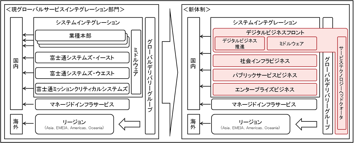 当社はこのほど、今後成長が見込まれるデジタルビジネスおよびグローバルビジネスの拡大に向け、体制強化を行います。今回、株式会社富士通システムズ・イースト、株式会社富士通システムズ・ウエスト、株式会社富士通ミッションクリティカルシステムズの国内大手SE子会社3社を11月1日に吸収合併した上で、2017年度末までにグローバルサービスインテグレーション部門の体制強化を段階的に実行します。