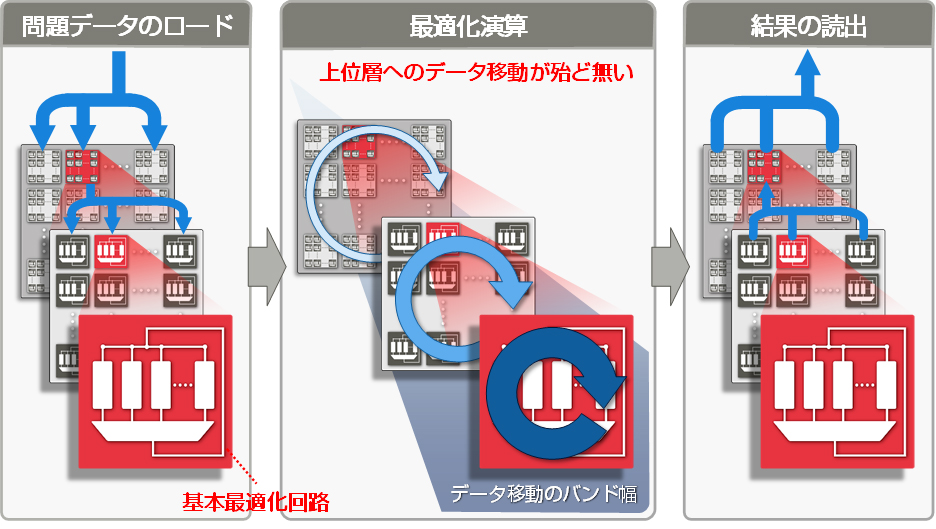 開発したアーキテクチャーでは、デジタル回路を用いた基本最適化回路を一つの単位として、これを複数個用いて、階層的な構造で並列に動作させます(図3)。このとき、基本最適化回路間のデータの移動を極小化する構造とすることにより、従来の半導体技術を用いて高密度に並列実装できます。また、基本最適化回路の内外で、自由な信号のやりとりができる全結合の構造を採用しているため、多様な問題を扱うことができます。