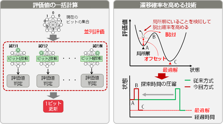 基本最適化回路では、確率論の手法を用いて、ある状態からより最適な状態への探索を繰り返し行います。今回、複数ある次の状態の候補に対するそれぞれの評価結果の値を一括して並列計算することにより、次の状態を見つけ出す確率を向上させる技術(図4左)と、探索の途中で局所的な解にたどり着いて膠着状態になった場合に、これを検知して脱出確率を高めるための評価値に一定値を繰り返し加えることで次の状態に移行しやすくする技術(図4右)を開発しました。これにより、高速に最適な解を求めることができます。