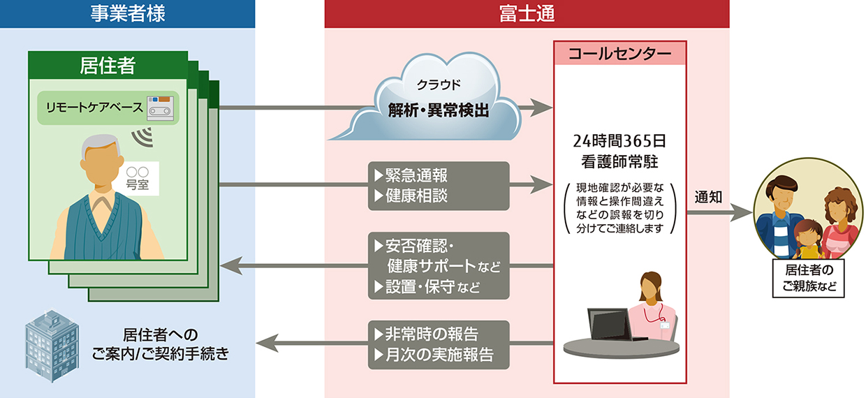 居住者宅内に設置した「リモートケアベース」がセンシングした音や人の動き、温湿度などのデータを当社のIoTデータ活用基盤「FUJITSU Cloud Service IoT Platform(フジツウ クラウド サービス アイオーティー プラットフォーム)」に集約し、「センサーアルゴリズム」により分析することで居室内の状況を把握します。会話の内容そのものを記録するのではなく、生活音から会話している様子を「発話」イベントとして検出し、必要な分析結果のみを利用するため、居住者のプライバシーに配慮した見守りを行うことができます。居住者の生活の気配が24時間確認できない状況や、通常では発生しない大きな音が発生した場合など異常が疑われる場合は、看護師が24時間365日常駐するコールセンターにアラートが通知されるため、早期に居住者の安否状況を確認することができます。そのほか、居住者からの緊急通報や健康に関する相談もコールセンターで24時間受け付けるなど、居住者が安心安全に暮らせるサービスをトータルで提供します。