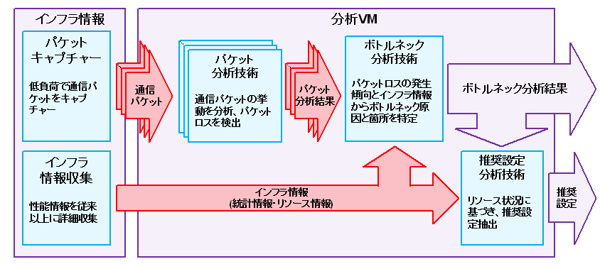 図3 パケット分析とインフラ情報からボトルネックを分析し、推奨設定を提示する技術