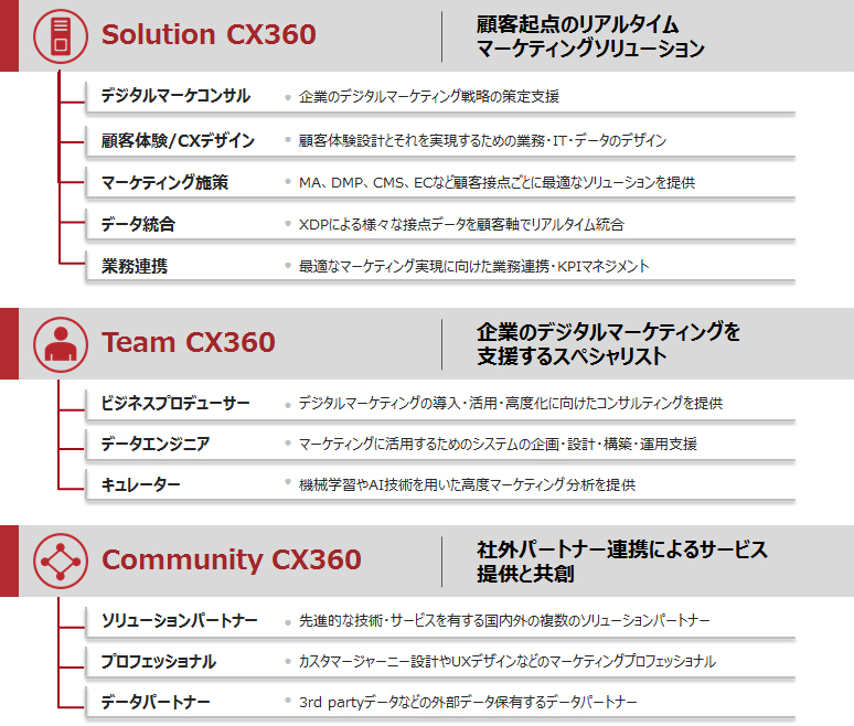 「CX360」は、国内流通業向けのITサービス市場でシェアNo.1(注1)の実績をもとに当社のデジタルマーケティングの技術やノウハウを結集し、顧客起点のリアルタイムマーケティングを実現する“Solution”、デジタルマーケティングプロフェッショナルによる“Team”、先進技術・サービス・コンサルティングを提供するパートナーとの共創を推進する“Community”の3つの枠組みから構成されています。