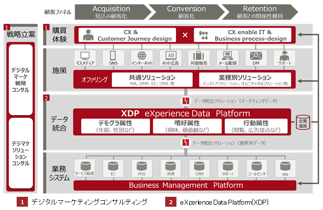 当社は、企業のマーケティング戦略策定をはじめとした各種コンサルティングおよび顧客ごとのデータ統合を実現し、リアルタイムマーケティングを支援するソリューション「eXperience Data Platform(エクスペリエンス・データ・プラットフォーム)」(以下、XDP)を2016年11月4日より順次提供します。