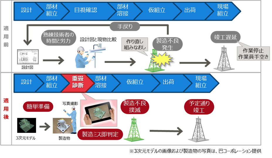 図1.「3D重畳 設計製造物診断」の導入前と導入後の作業比較(鉄構業での利用イメージ)