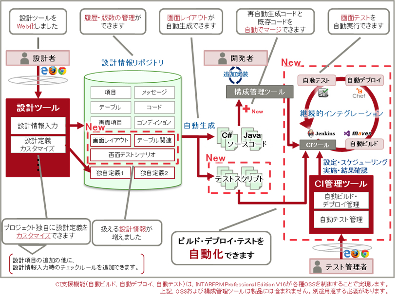 今回、3つの製品から構成される「INTARFRM」のうち、各種CIツールの連携を容易に行う機能を追加した「INTARFRM Professional Edition V16」を提供し、お客様の開発期間の短縮と品質向上の実現を支援します。