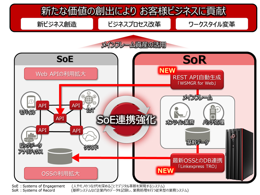 これにより、当社メインフレーム上のデータやアプリケーションといった基幹システム(SoR:システム オブ レコード)資産を、オープンシステムやクラウドシステムなどデジタル革新を行うシステム(SoE)からこれまで以上に容易に利用できるようになります。