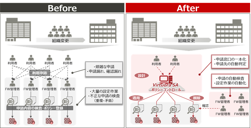 企業の組織変更や人事異動、分社や合併を行う場合には、関連する様々なセキュリティ装置のポリシー変更(注3)が必ず必要となります。従来は各組織が装置単位に運用していたため、変更する規模に応じて稼働が増加し、作業ミスの発生が懸念されていました。本ソリューションでは、組織や関連会社を横断した一体的な運用を行い、ポリシー設定作業を自動化することで、変更規模によらず作業コストを大幅に削減することができます。